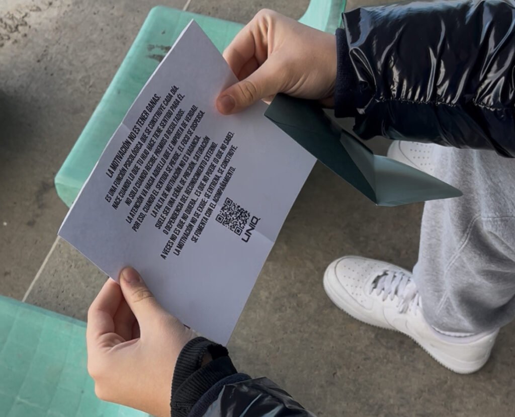 Y, al final del texto, un código QR. Sin ninguna llamada a la acción, porque lo que queremos es que sea la curiosidad la que mueva a un padre o un madre a querer saber más. Solamente desde ahí se pone en marcha la atención activa. Y nosotros queríamos que esa atención activa llevase a una idea. A nuestra landing: